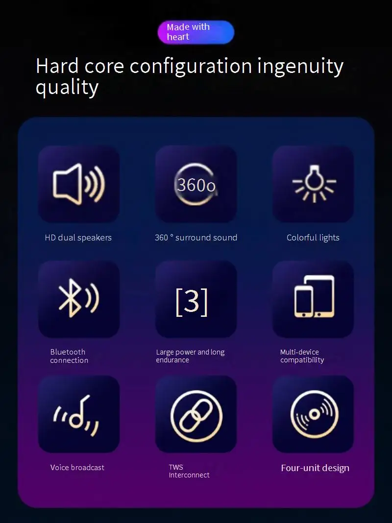 Function | Usb flash drive/BT/TF Card /9 colors LED lights/ TWS1+1/3 audio effect EQ modes/Hands-Free Speakerphone | ||||||